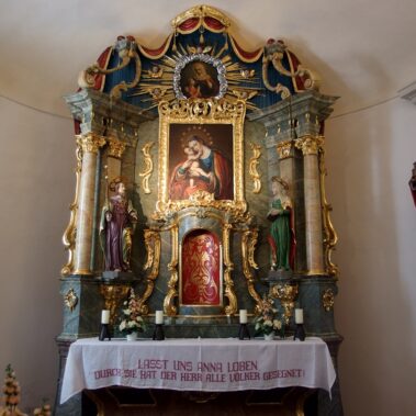 Als Patrozinium wurde „Maria hilf“ gewählt, galt der Wallfahrtsort ja auch der Verehrung Mariens und des Gnadenbilds, weshalb der Berg damals „marianischer Berg“ genannt wurde. Wie kommt es, dass heute alle vom Annaberg und der Annabergkirche sprechen? Der Weihetag Ende Juli ist der Namenstag der Heiligen Anna. Von Beginn an gab es ein Annafest mit einem Annamarkt, das jedes Jahr anlässlich der Weihe der Kirche gefeiert wurde. Und das mit wenigen Unterbrechungen bis heute. Ab Mitte des 19. Jahrhunderts bürgerte sich bei der Bevölkerung der Name Annaberg ein. Alte Postkarten und sogar Pfarrer Hofmann bezeichneten zu Beginn des 20. Jahrhunderts die Wallfahrtskirche als „Annakirche“.
