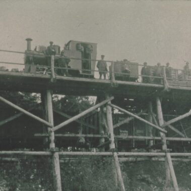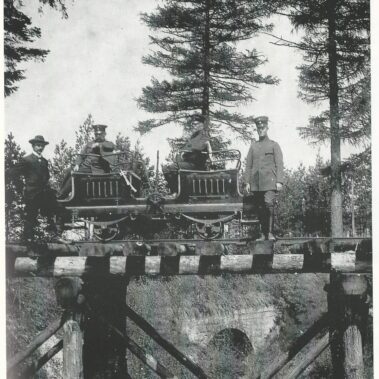 Eine Draisine auf der Brücke am Röthelweiher 1909. Der Zivilist ist Königl. Baurat Wilhelm Kemmler.