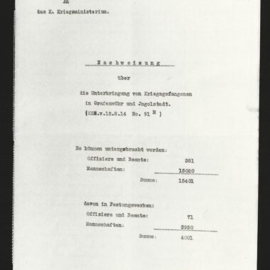Ein rasantes Wachstum bescherte die Eröffnung des Truppenübungsplatzes 1910 der Stadt Grafenwöhr. Vom verschlafenen Landstädtchen mit rund 900 Einwohnern verdoppelte sich innerhalb eines Jahres die Einwohnerzahl durch die Ansiedlung von Gastronomie, Geschäften und Betrieben. Doch bereits im 1. Weltkrieg sollte diese Blütezeit für die Stadt ein Ende haben. Der Truppenübungsplatz lief unterdessen im Hochbetrieb. Hier erfolgte die Zusammenstellung und Ausbildung für den Fronteinsatz, außerdem übte die bayerische Armee weiter. Zusätzlich zum Militärbetrieb mussten Kriegsgefangene aufgenommen werden und so wuchs der Truppenübungsplatz in den ersten Wochen des Krieges rasant zum größten Kriegsgefangenenlager Bayerns heran. Schon rund vier Wochen nach Kriegsbeginn kamen im September tausende französische Gefangene, ab November schließlich auch Russen und Zivilisten, darunter Frauen und Kinder, so dass Ende 1914 insgesamt 23.314 Kriegsgefangene in die Baracken am Truppenübungsplatz gepfercht waren. Bei einer ausgelegten Kapazität von 10.500.