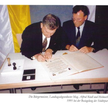 Nach zweijähriger „Probezeit“ wurde am 8. Juli 1995 die Städtepartnerschaft bei einer Festsitzung in Grafenwörth besiegelt und ein großes „Partnerschaftsfest“ gefeiert. Seither besuchen sich Delegationen der beiden Gemeinden jährlich und pflegen den Zusammenhalt nicht nur bei bayerischem Bier und österreichischem Wein. Das zeigte sich bei der Hochwasserkatastrophe, von der Grafenwörth im Jahr 2002 heimgesucht wurde. Der damalige Bürgermeister Helmuth Wächter und einige Mitglieder der Freiwilligen Feuerwehr und des Bauhofes fuhren mit Spenden im Gepäck zu den Freunden nach Österreich, um in der Not zu helfen.