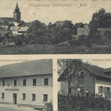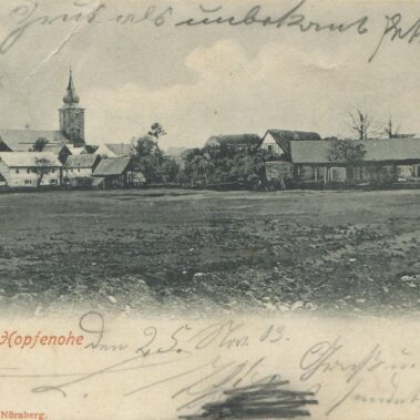 Die erste urkundliche Erwähnung des Dorfes Hopfenohe geht auf das 11. Jahrhundert zurück. Die Ortschaft entstand aus einem Rittergut und war die älteste Siedlung in der Gegend. Wie bei vielen Ortschaften änderte sich im Laufe der Jahrhunderte mehrmals der Ortsname. Das Dorf befand sich 4 Kilometer ostwärts von Auerbach an der Bezirksstraße Auerbach-Eschenbach. An den ehemaligen Ort Hopfenohe erinnert heute nur noch die Ruine der Kirche „St. Peter und Paul“. Wegen der Erweiterung des Truppenübungsplatzes Grafenwöhr 1938/39 wurde das Dorf von der Reichsumsiedlungsgesellschaft aufgelöst. Hopfenohe zählte zur Zeit der Umsiedlung um die 200 Einwohner und 26 Anwesen. Neben Kirche und Schule gab es zwei Wirtshäuser, eine Metzgerei, Schreinerei, Schneiderei und einen Krämerladen.