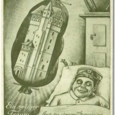 Vielleicht wollten sie damit ihren Lieben ein gutes Gefühl vermitteln, dass es ihnen fern der Heimat gut geht. Oder der Schwarze Humor war eine Methode, dem mühsamen Leben im Truppenlager etwas Leichtigkeit zu verleihen. Wir wissen nicht genau, was hinter diesen Witzpostkarten steckt.
