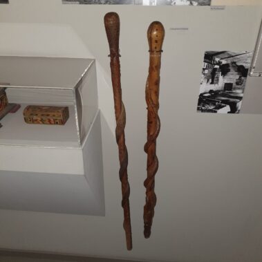 Schon rund vier Wochen nach Beginn des Ersten Weltkrieges kamen im September tausende französische Gefangene, ab November schließlich auch Russen und Zivilisten an, so dass Ende 1914 insgesamt 23.314 Kriegsgefangene in die Baracken am Truppenübungsplatz gepfercht waren. Es entwickelte sich ein Lagerleben und neben den vielen Arbeiten, zu denen die Gefangenen abgestellt wurden, fertigten sie in ihrer Freizeit viele Souvenirs, um sich ein paar Pfennige zu verdienen. An dem erhaltenen Holzstab ist eine Schlange erkennbar, die Jahreszahlen 1914, 1915 und die Aufschrift „Souvenir de Grafenwöhr, Baviere“. Der Holzstab hat in der Militärabteilung des Museums einen schönen Platz bekommen.